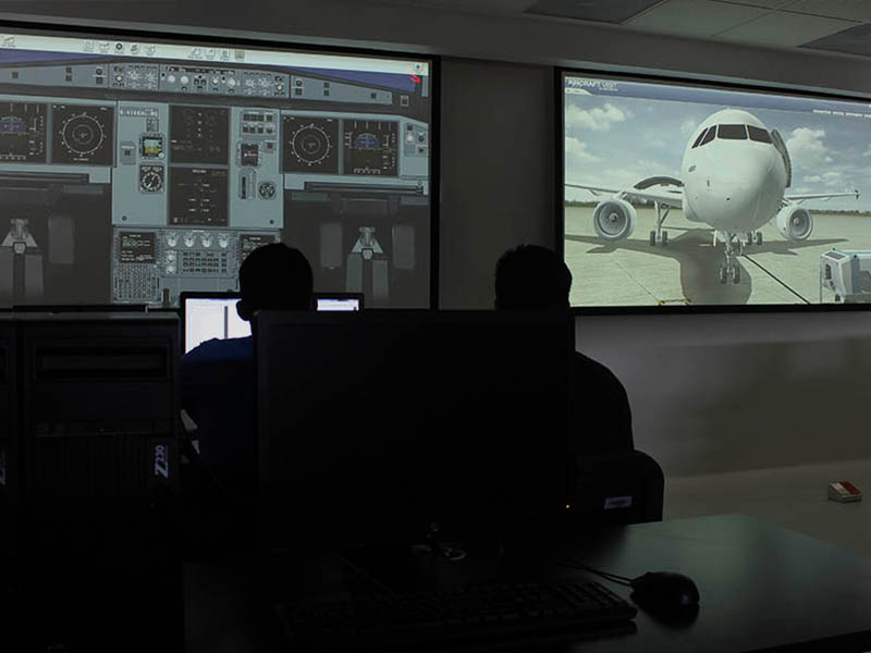 In this laboratory, students develop some of the following activities: comprehension and understanding of new generation aircraft systems such as electric, pneumatic, air conditioning, engines, hydraulic, navigation, oxygen, fuel, etc. They also understand the description, location, operation and visualization of the aircraft systems and their components. They can also improve their proficiency of aeronautical technical English with the support of audiovisual equipment related to the software used.